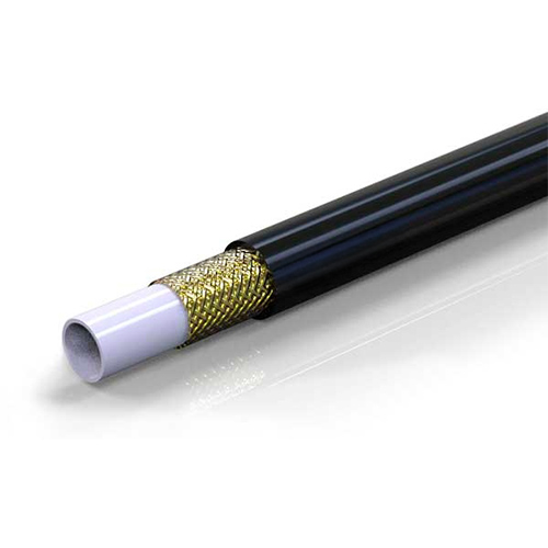Tubazione con anima interna in poliammide, rinforzo in treccia acciaio ad alta resistenza e rivestimento esterno in poliuretano antiabrasione e resistente al contatto prolungato con olii e lubrificanti.
