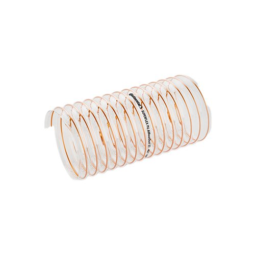 Tubo con parete costante di 0.7 mm in PU polietere antistatico, resistente alla fiamma secondo DIN 4102-B1, rinforzato con spirale a passo destro in acciaio ramato ricoperta in PU.